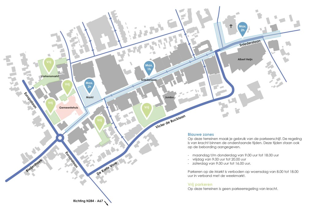 Als je het hart van Bladel bezoekt, raden we je aan om te parkeren op de nabijgelegen parkeerterreinen. Voor diverse gebieden in het centrum geldt een blauwe zone. Hier heb je een parkeerschijf nodig. Let op de aangegeven parkeertijdlimieten om eventuele boetes te voorkomen.